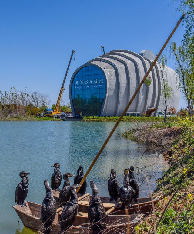 愛情公園是洪澤湖濕地景區(qū)內(nèi)的一處節(jié)點(diǎn)性景點(diǎn),象征愛情的棠梨樹、西方神話中的丘比特、中國傳統(tǒng)神話中的鵲橋以及熱情綻放的郁金香都成為了這里充滿浪漫情懷的元素。 洪澤湖魚族館是整個(gè)濕地公園的核心地標(biāo)之一,這里是全國淡水魚品種最全、數(shù)量最多的展示館,建筑造型宛如一條洪澤湖大鯉魚游弋在濕地景區(qū)之中,去的當(dāng)天正逢魚族館外立面大整修,期待一條更神采奕奕的鯉魚呈現(xiàn)在景區(qū)內(nèi)。 在魚族館水塘邊,一群魚鷹傻站在船上,嘴里都叼著魚卻無法下咽,原來它們的脖子都被扎住了,這到嘴的魚下不了肚又舍不得吐出來,只好苦苦叼在嘴里嘗嘗魚腥味了。