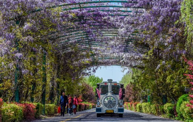 從魚族館往千荷園的路上,爬滿紫藤花的綠蔭道成為吸引諸多游客駐足拍攝的地點(diǎn)。